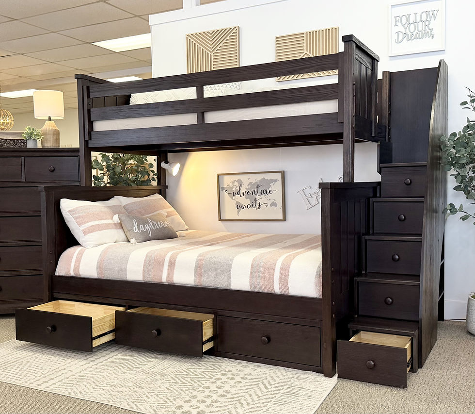 Our standard 59" x 96" full/full bunk bed with stairs (shown left) is the ultimate sleep + storage setup...
