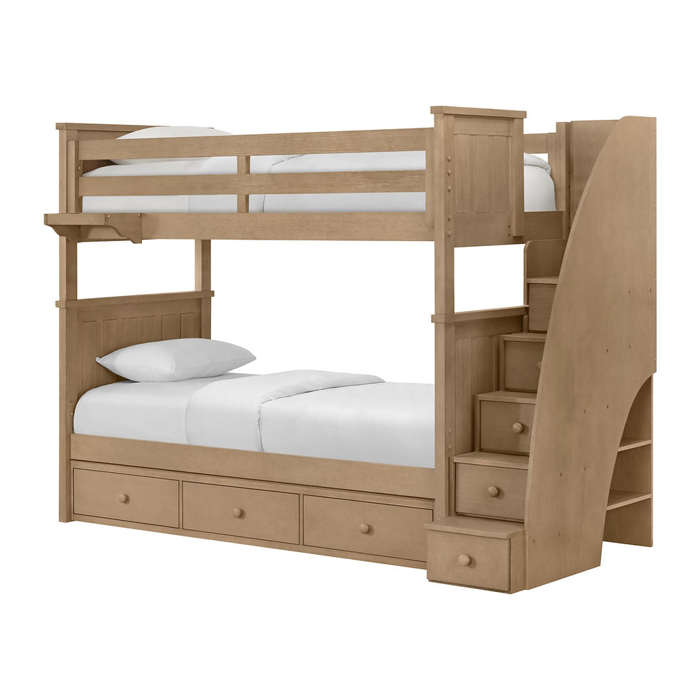 Our standard 59" x 96" full/full bunk bed with stairs (shown left) is the ultimate sleep + storage setup...